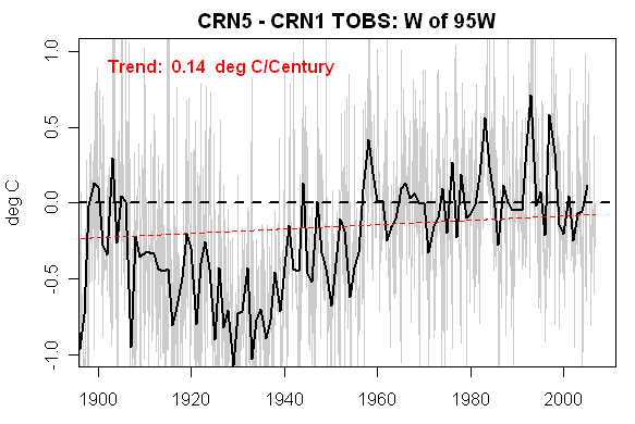It would be interesting to plot together rural stations all over the USA (whatever their CR would be) and to see the trend. I recall one paper of Christy and Spencer http://www.marshall.org/pdf/materials/415.pdf, where they showed some 6 or 7 stations on High Sierra in California that don’t show almost any warming trend in the last 30 years. Those are rural stations of course. If we plot them with some 10 aditional more on the West with CRN 1 and 2 on the East what will be the resulting trend?
