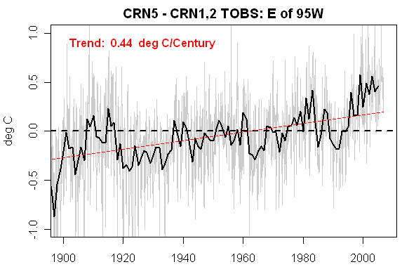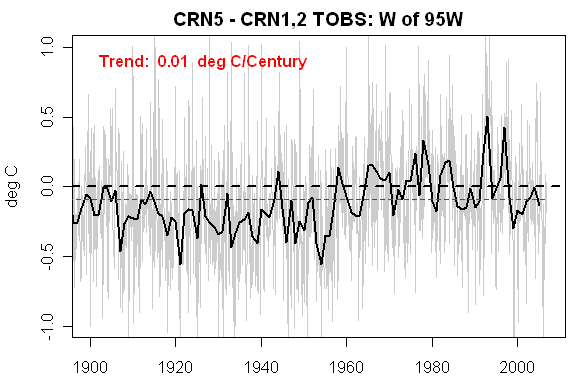 The median longitude in the USHCN network is 95W. As a coarse cross-check, I split the stations into groups east and west of 95W and compared CRN1 to CRN5 stations and secondly CRN1,2 to CRN5 stations. Doubtless many other variations and crosscuts can and will be identified, but this seemed like a pretty simple first check on regional issues.