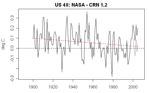 Regardless of the above, the differences between the NASA temperature history for the U.S. (with its relatively warm 1930s) and the CRN1,2 averages (here averages of east and west stations are done first and then averaged) does not show a marked trend, a point noted by John V. Actually, it’s somewhat downward. (Below: dotted – post Y2K NASA version;solid – pre Y2K):