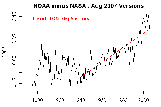 However, the situation is quite different with NOAA, as shown in the next graphic, which shows the difference between NOAA and NASA temperature histories for the U.S. (NOAA taken from http://www1.ncdc.noaa.gov/pub/data/cirs/drd964x.tmpst.txt). As you see, the NOAA trend relative to NASA is about 0.33 deg C per century since 1941 [ Note: this is a revised version of earlier graphic.