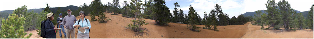 In the second part of Day 1, we sampled at the site labelled above as “Almagre Base”. We were looking for Graybill’s “Frosty Park” site, which we figured was near this site. I don’t think that this site matched Graybill’s Frosty Park but did have bristlecones and the same lack of understory vegetation. I was very tired and getting affected by the altitude (to which I wasn’t used) by this point and look even more bedraggled than usual; however, the three women and Pete were doing fine. By this point, we figured that Graybill’s Mount Almagre site was somewhere up the road where it was eventually located, but we’d done enough for the day. We’d collected about 20 cores. I’m sure that Rob Wilson would have collected more, but typical dendro site collections were often around this size. Pete has some nice panoramas at the gallery – look at them full-size for a wonderful vista. Below is a scaled-down jpg of a panorama of Almagre Base showing just how little understory vegetation was on the top of the knoll where we sampled. Is this evidence of dryness as well as cold? The understory at Elk Park was equally sparse or sparser.