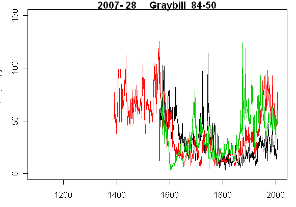 The first is our Tree 28 (Graybill 84-50.) In this case, we have 3 cores shown below in black, red and green. Here the strip barking seems to have introduced a pretty complicated pattern: notice that the green core is lowest in the 17th century, highest in the 19th century and in the middle in the later 20th century, completing the permutation of cores. So it’s not that one aspect of the core is always the widest – but places can change. In the mid-20th century, there was a strong increase in the red core, accompanied by an equally strong decrease in the green core. Arrrgh.