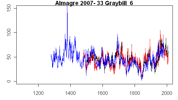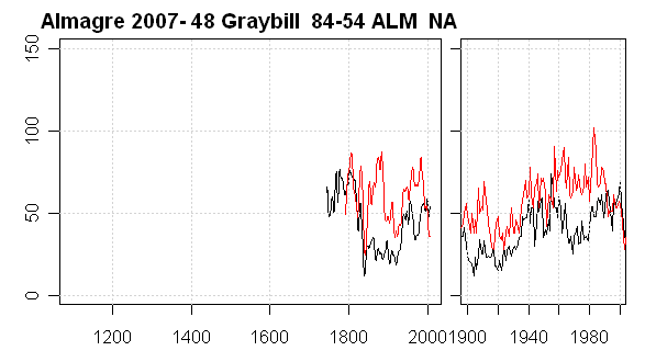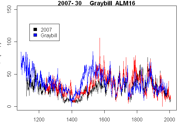 The next tree cross-matched to archived data is our Tree #33 (Graybill 84-43), which is archived as ALM06. Again here is a plot showing our measurements in black-red and Graybill’s in blue. Once again, there is a good match between our measurements and Graybill’s (although our core was not as long as Graybill’s.) In this case there are no large discrepancies between the two cores – something that is not always the case, and which seems like a useful check on ellipticity.