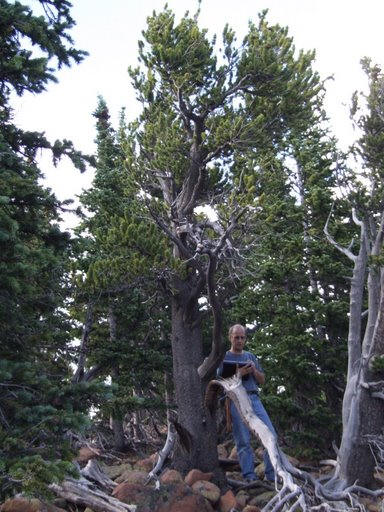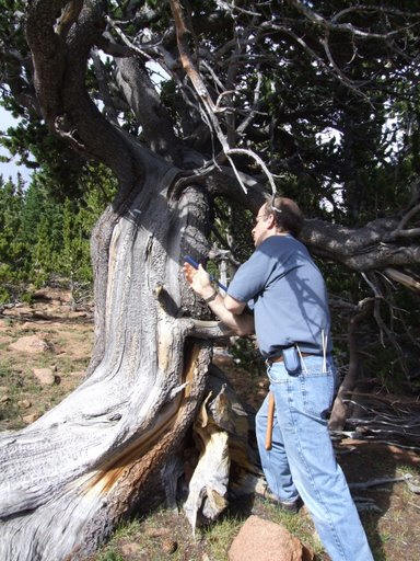 These so-called’ strip-bark’ trees can have active cambium that is only a few centimeters in width. Foliage and cones are also accordingly limited. Trees of this nature were the primary focus of investigation whenever possible. They were most commonly found and sampled in stands of bristlecone and limber pine in the Great Basin and in stands of foxtail pine in the Sierra Nevada.
