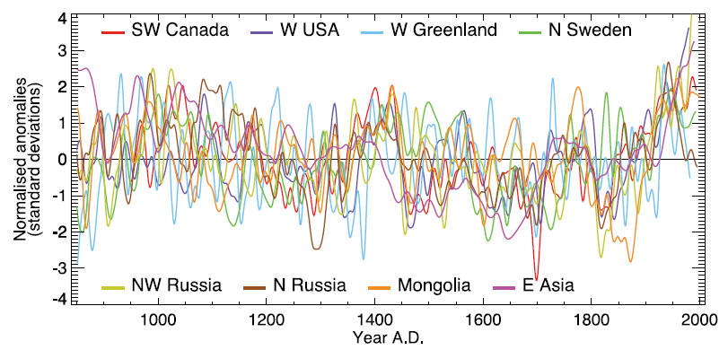 Box 6.4, Figure 1. The heterogeneous nature of climate during the Medieval Warm Period is illustrated by the wide spread of values exhibited by the individual records that have been used to reconstruct NH mean temperature. These consist of individual, or small regional averages of, proxy records collated from those used by Mann and Jones (2003), Esper et al. (2002) and Luckman and Wilson (2005), but exclude shorter series or those with no evidence of sensitivity to local temperature. These records have not been calibrated here, but each has been smoothed with a 20-year filter and scaled to have zero mean and unit standard deviation over the period 1001 to 1980.
