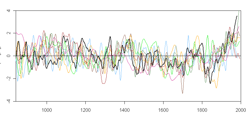 Rob’s point here is very disingenuous (to use Mann-speak) since millennial reconstructions are addicted to bristlecones and foxtails. Reconstructions using them include not just MBH98-99 (which is not robust to the presence/absence as admitted by even Wahl and Ammann); but also Crowley and Lowery 2000 (two bristlecone series, including Almagre); Esper et al 2002 (two foxtail series); Mann and Jones 2003 (Mann’s PC1); Rutherford et al 2005 (Mann’s PC series flagrantly unamended); Moberg et al 2005 (3 bristlecone series); Hegerl et al (Mann’s PC1 and the Esper foxtail average); Osborn and Briffa 2006 (Mann’s PC1 and the Esper foxtail average); Juckes 2007 (the two Esper foxtail series in his Union reconstruction). In each of the studies where Mann’s incorrect PC methodology is not used, there are only a small number of series used (6-18 in the medieval portion). Can a couple of strongly HS series mixed with white or low-order red noise in a CVM procedure yield a HS recon? Readers of this blog know the answer to this, although “professional” climate scientists seem mostly unfamiliar with the statistical issues.