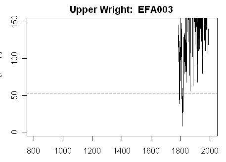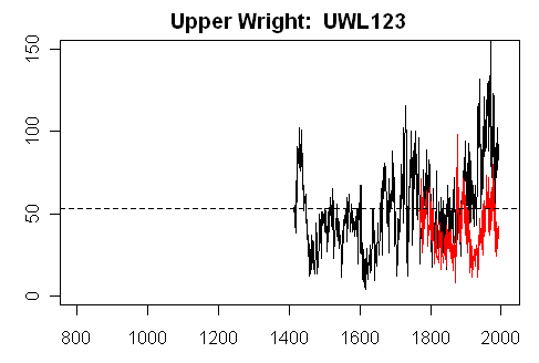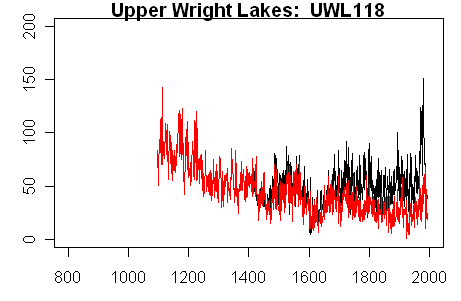 In the Upper Wright Lakes data, there are not a lot of cores that go up to data that have duplicates. I’ve noticed the same sort of radial asymmetry in a quick look in trees UWL118 and UWL123 as shown below. Do you recall anything about these trees?