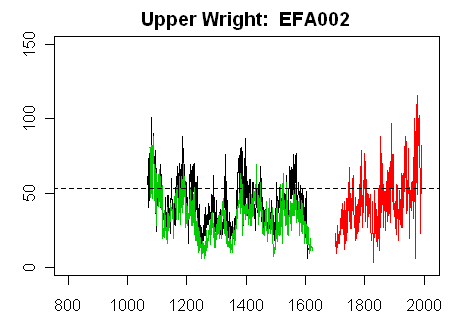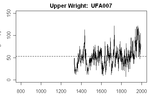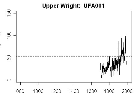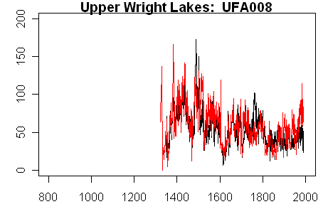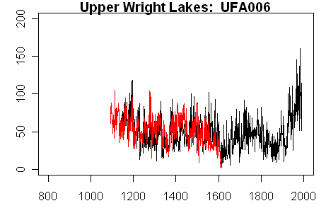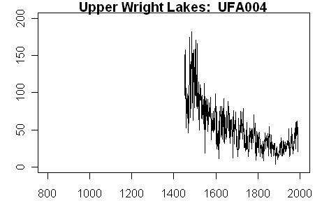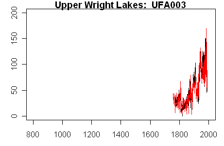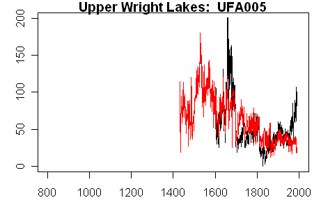 After noticing the remarkable difference in core widths within one strip bark tree in Tree 31 from our drilling at Almagre, I examined the data from Upper Wright Lakes (and Boreal Plateau) and noticed similar divergence between individual cores in some trees where two cores were archived. I sent an email to Andrea Lloyd observing the similarity in pattern in some Upper Wright trees to strip bark Almagre trees and inquired whether the trees at Upper Wright Lakes with similar patterns were also strip barked. I got a very cordial reply in which she said that the hypothesis was “intriguing!”, that she recalled that some trees had strip bark and undertook to examine her notebooks. She has now sent some very interesting fresh information from her notebooks. Pay particular attention to UFA003 and UFA004 below.