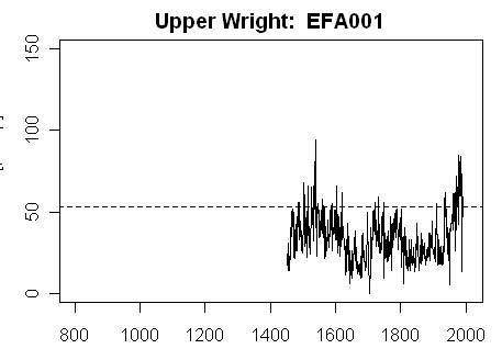 In passing, the nomenclature for sites in Lloyd and Graumlich 1997 is inconsistent with the archived information and Lloyd provided a concordance, agreeing with the need for such concordance information. She said that Boreal Plateau = Upper Treeline 1 and Upper Wright Lakes = Upper Treeline 3, East Slope, and Meadow. Graumlich did not archive one site at Cirque Peak (= Upper Treeline 2) on the basis that that she didn’t do any climate reconstructions on that one. However, Lloyd agreed that the data should still be archived and undertook to locate and archive the data. Lloyd had no information on the status of data from some of Graumlich’s earlier sites (e.g. Tyndall), that were reported in Graumlich 1991.