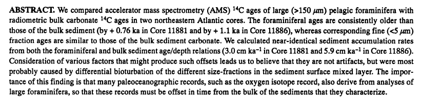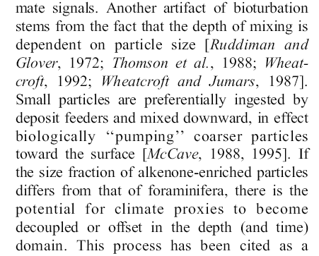 McCave (1988), entitled “Biological pumping upwards of the coarse fraction of deep-sea sediments” reports that the coarse fraction in the mixed layer is older than the fine fraction and the difference in age can be substantial. This process was summarized by Sachs et al 2000 as follows:
