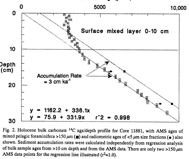 You can see how the potential knock-on effect of the mixing problem – whether through bioturbation or mechanical means. The G Bulloides series has been extracted from the coarse fraction (plus 150 μm). Suppose there has been upward biological (or other) pumping of the coarse fraction relative to the fines. The offsets in radiocarbon dates in other places can be several hundred years.