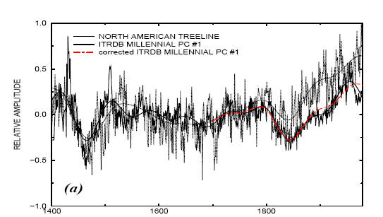 Next, the Jacoby chronologies used in MBH99 were obsolete even at the time – a point made in MM03. For example, Mann used a TTHH chronology with values back to 1459 while the archived chronology goes back only to 1530. In the final archive, no chronology is presented for a period that does not contain at least 3 cores: Mann used an early version which included a period prior to 1513 where there was only one core. In MBH, Mann stated that they carried out quality control on their chronologies to ensure that there was a match between the measurement data and the chronology. In the case of one of the Jacoby chronologies (Churchill), there was negligible correlation according to this test. A couple of years ago, I wrote to Rosanne D’Arrigo observing that the Churchill chronology could not obtained from the archived measurement data. She said that the archived chronology was wrong and said that she would replace it at ITRDB; however, this has not taken place two years later.