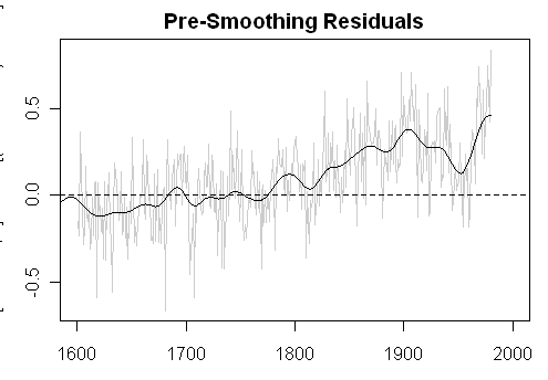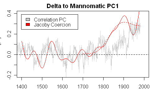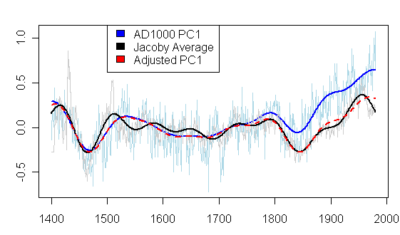 Let y be the “unadjusted” PC1, and x be the Jacoby and D’Arrigo NT series. Let sy represent the filtered value of the series y using their 50-year filter s, whatever its details are, and sx represent the filtered value of the series x. They define their residual R = sy – sx, but since this is presumably a linear filter, this is equivalent to s(y-x), ie applying the filter s to the differences directly. They then apply a 50-year filter to R, and then a further trend extraction that retains timescales longer than 150 years after 1700 and simply flattens the series before 1700. Call the combined effect of these two filters S, so that the resulting adjustment is SR = Ss(y-x) = Ssy – Ssx. Their “adjusted” PC1 is then y* = y – SR = Ssx + (y – Ssy). In other words, after 1700 they just replace PC1 with the doubly smoothed NT series, and then add the high frequency variation in PC1 back in to make it look like PC1 even though it has the trend of NT. Before 1700 the procedure does nothing.