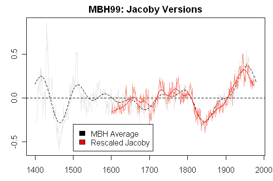 Next, there are some differences between the Jacoby target used in MBH99 and the reconstruction published by Jacoby and D’Arrigo (1989, 1992). The MBH Jacoby version goes 200 years earlier than the Jacoby-d’Arrigo reconstruction, which began only in 1601, not in 1400.) The figure below compares the Jacoby and d’Arrigo reconstruction (scaled to match the MBH99 version) and the MBH99 target (light grey).