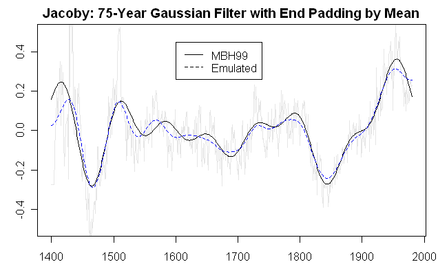 Now, a little Mannian puzzle. How is the smooth of the Jacoby average done? In this case, we have the input data and the output data, so it’s possible to see if we can match the result. In the caption to Figure 1b, Mann says that you used a “75 year low-passed” filter. In tree ring jargon, a “75 year” filter is often used to describe a filter with gaussian weights that is long enough to pass 50% of the variance through 75 years (see Meko’s notes on this). In the figure below, I tried a 75-year gaussian filter and get something that looks similar to the Mannian result, but not the same. I’ve experiment with other filters and other end period approaches – reflection padding and Mannomatic padding yield worse results. Lowess filters don’t improve things. So I don’t know. I’ve archived materials for people to test: see columns 1 and 2 in the data set. A smoothing point to bear in mind: why is the delta calculated after smoothing: does it matter if the deltas are calculated first and smoothing done later?