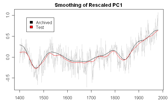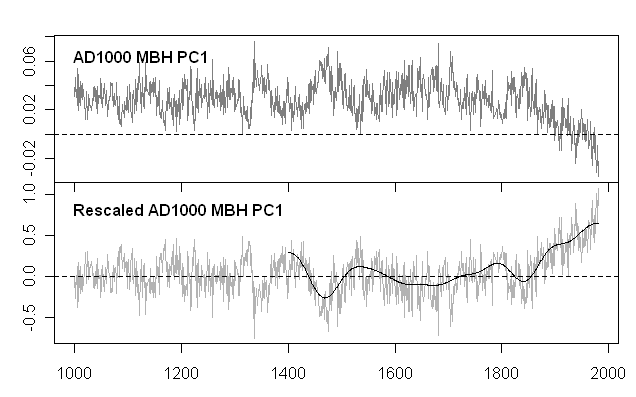 In the top panel, I’ve shown the Mannian AD1000 PC1 as originally calculated. I can replicate this calculation from original chronologies (using the incorrect Mannian PC method.) The plot here is from the PC1 at the former Virginia Mann FTP site. It is inverted. PC series have no native orientation and the inversion here doesn’t trouble me. If you want to interpret the PC1 as a weighted average of the underlying chronologies (mostly bristlecones), then you can choose the orientation from positive weights as opposed to negative weights. A second point about the native series is that the PC series is calculated here from an svd algorithm and as a result the sum of squares adds to 1 i.e. the amplitude is very small. Occasionally one sees internet commentary purporting to find a flaw in the red noise simulations in MM (2005 GRL) on the basis that the amplitude of the PC series is “too small”; the amplitude of our simulations is exactly the same as the amplitude of the Mannian PC1 and the people who raise this argument don’t know what they’re talking about (not that that stops them.)