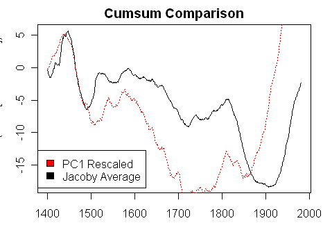 It looks as though the rescaled PC1 has been recentered on some portion of 1400-1900 so that it more or less matches the mean of the “target” Jacoby series in the 1400-1780? period. We’ve seen from the log CO2 diagram that these selections can be opportunistic. If the Jacoby series has been used as a target reference, then it should be possible to find some period over which the Rescaled PC1 mean is equal to the Jacoby mean. As a way of exploring for such a period, I plotted cusums for the rescaled PC1 and the Jacoby target as shown below: they cross for a period of about 1400-1865. Or maybe the reference period doesn’t start in 1400 but some other period. It’s hard to say. But it looks like something like this is going on. Of course, this sort of calculation presumes mathematical precision. Ideas are welcome.