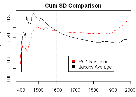 A tougher problem occurs with the rescaling of the PC1. The sd of the PC1 (0.21) is higher over (say) the 1400-1865 period .than the sd of the Jacoby average (0.18). You can see this in the diagrams. So it’s not obvious how the PC1 has been rescaled. Is there some period over which the sd of the target matches the sd of the rescaled PC1? To test this, I did a “cumsd” calculation modeled on the cusum calculation for means. In this case, the two standard deviations match for a reference period of 1400-1600, which is round, but do not match for other periods. Did Mann re-center and re-scale on different periods? If so why? Or is there some other rescaling principle entirely? I have no idea how this rescaling was done and it bugs me.
