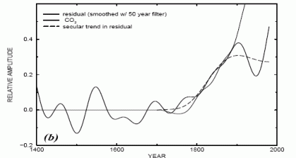 A number of the highest elevation chronologies in the western U.S. do appear, however, to have exhibited long-term growth increases that are more dramatic than can be explained by instrumental temperature trends in these regions. Graybill and Idso [1993] suggest that such high-elevation, CO2-limited trees, in moisture-stressed environments, should exhibit a growth response to increasing CO2 levels. Though ITRDB PC #1 shows signfi cant loadings among many of the 28 constituent series, the largest are indeed found on high-elevation western U.S. sites. The ITRDB PC#1 is shown along with that of the composite NT series, during their 1400-1980 period of overlap (Figure 1a). The low-frequency coherence of the ITRDB PC#1 series and composite NT series during the initial four centuries of overlap (1400-1800) is fairly remarkable, considering that the two series record variations in entirely different environments and regions. In the 19th century, however, the series diverge. As there is no a priori reason to expect the CO2 effect discussed above to apply to the NT series, and, furthermore, that series has been verified through cross-comparison with a variety of proxy series in nearby regions [Overpeck et al, 1997], it is plausible that the divergence of the two series, is related to a CO2 influence on the ITRDB PC #1 series.