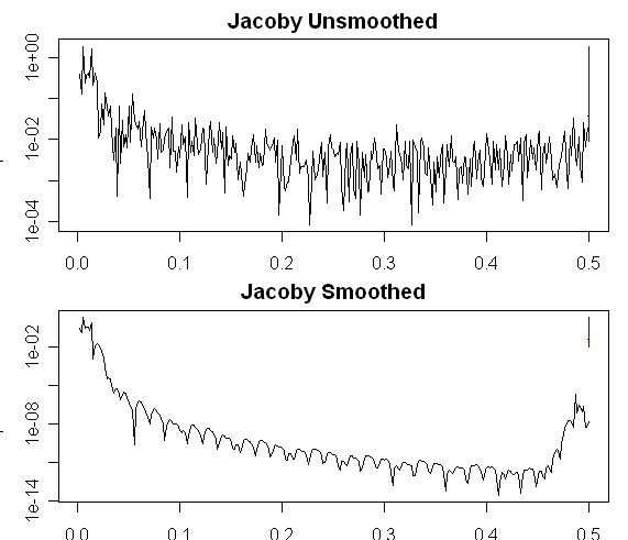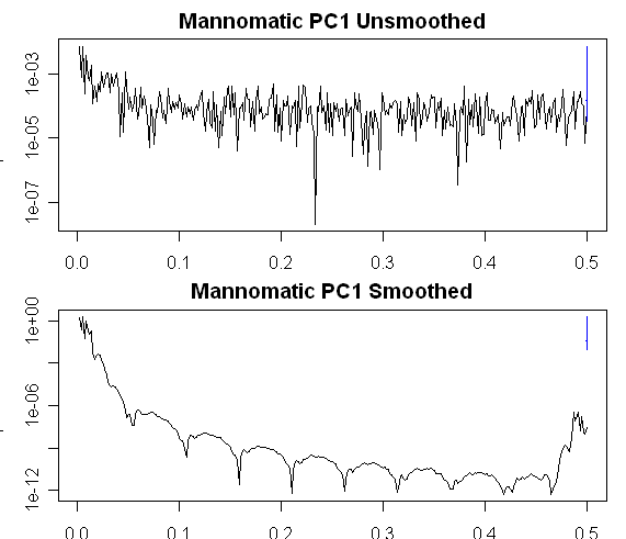 I’ve inserted spectra comparing the smoothed and unsmoothed versions of the two series. The smoothing tends to leave very high-frequency power unchanged and have most of its impact in medium frequencies. Strange,
