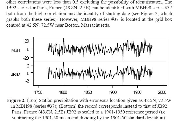 Today, I noticed something very interesting in his SI, that goes back to MM 2003 and demonstrates the fanatical resistance to admitting even the slightest error. In MM03 here, we observed that there was an exact match between the precipitation series in Mann’s gridcell 42.5N 72.5W (in New England) and the GHCN historical series for Paris, France. I summarized the match at the time with the phrase: