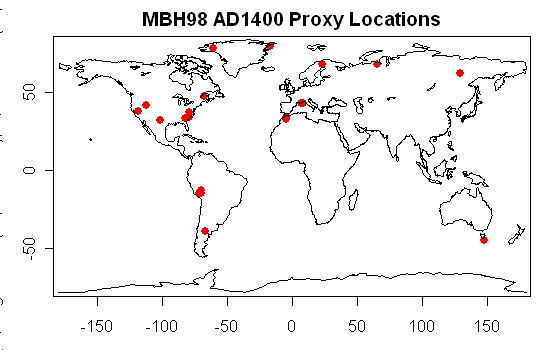 So, Mission Impossible Team, your task is to determine the weights of the individual proxies in the Mann et al 2007 RegEM version and to plot them on a map such as the above. Your instructor, the brave and resourceful JEG, has unfortunately gone missing, perhaps swallowed up in the swamp of Mannian pseudo-covariances. But before going missing, he left us with the message that the failure to show location maps was pseudo-science. (Yes, he didn’t say that the failure to show a weighted location map was pseudo-science, but he’d probably have agreed that it was a good idea.) So, Team, in memory of JEG, return with the weighted location map for the AD1400 Mann et al 2007 RegEM proxy network. The fate of the planet depends on you.