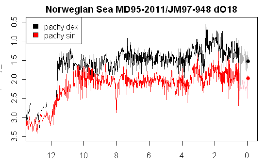 The archive includes dO18 values for both N pachy dex and N pachy sin for both MD95 and JM97; the combined data being shown in the plot below, with a slight difference in color denoting the change in core. Do these measurements indicate that dO18 values in the Norwegian Sea are at unprecedented levels? You tell me.