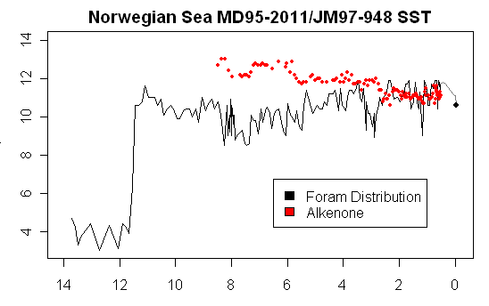 While dO18 is sometimes used as a temperature proxy (e.g. Lonnie Thompson’s ice core), it has not been used as one here. SST was estimated in two different ways for this core – (1) by an analog based on foram distributions; (2) alkenone SST. The SST estimates from foram distribution are archived for both MD95 and Jm97 and are plotted below; for alkenone SST, only the MD95 values are archived. I’ve been informed that JM97 values have been calculated but they have not been archived or reported, apparently because of inconsistency problems. Here is a plot: