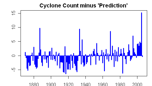 Willis E. in a much earlier thread detrended the storm count time series and removed the cyclical component. He graphed it and I did a chi square test on the adjusted time series and calculated a p value of approxiametly 0.9 — which I consider a very good fit.