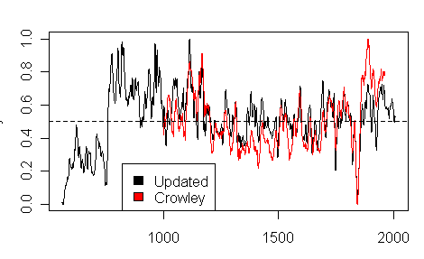 In addition to trees seemingly being lousy thermometers, I am suspect of the differences between the Crowley series and the updated one. Crowley shows a cooler LIA and a warmer modern period. This gives a very noticable increase over the last 500 years. The updated one is warmer in the LIA and cooler in the modern period, with neglibible “warming” over the last 500ish years.