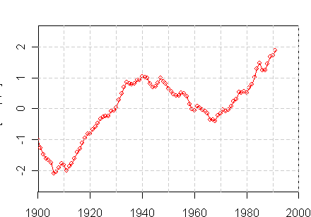plot(1900:1997,x[temp],type=”l”,ylim=c(-2.5,2.5),col=”red”,xlim=c(1900,2000),xaxs=”i”)