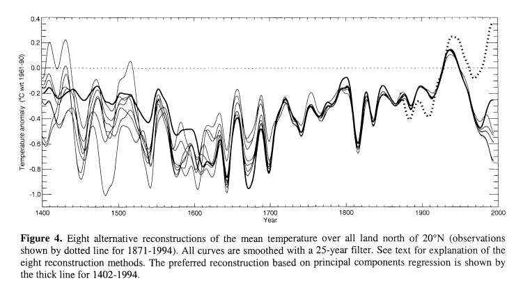 The following reconstructions have been taken from the source “references listed below, and then RECALIBRATED to obtain estimates” of April-September mean temperatures from all land regions north of 20N. All series are temperature anomalies in degrees C with respect to the 1961-1990 mean.