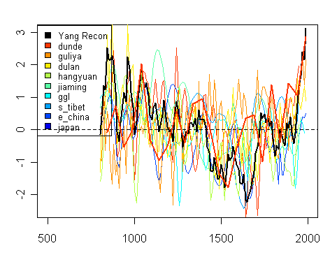 The Yang series was originally created as a composite of 9 heterogeneous Chines proxy series, two of which were Thompson ice core dO18 (Dunde, Guliya). There are a couple of Yang versions, somewhat differently weighted. While Loehle critics have been quick to (correctly) notice that many contributing series end in mid-20th century, the ending of half the Yang series in mid-century has not been given equal attention. Only 4 of 9 series continue to 1990, of which two are the two Thompson ice cores, which end up dominating the results by the close. The next figure plots the 9 Yang proxy series, together with the composite (also re-scaled), as a spaghetti graph of scaled series. One of the interesting aspects of the re-scaling of the composite (which was done in the IPCC graphic) is that none of the individual components are at 3 sd units at the close. The E China documentary series is only at about 0.5 sd units.
