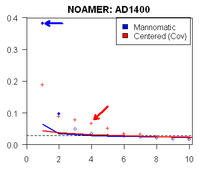The blue arrow shows the eigenvalue of the bristlecone-dominated PC using Mannian methods; the red arrow show the eigenvalue using a centered calculation. These results were reported in MM2005 (GRL) where we stated that explained variance of the bristlecones wsa reduced from 38% (the blue arrow) to 8% (the red arrow) and that the bristlecones were not the “dominant component of variance” in the North American network, as previously claimed by Mann et al – an impression that they would obviously have been given by their incorrect PC calculation. So when they say that the error didn’t “matter”, it certainly mattered when they said that this particular shape was the “dominant component of variance” or the “leading component of variance”, claims that they made in response to our 2003 article.