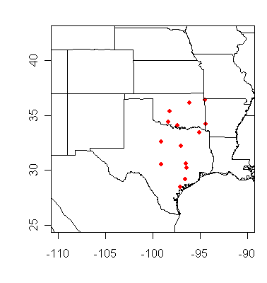 Today I’ll report on applying this approach to the Stahle Texas-Oklahoma network also used in MBH98, the combination of the Stahle SWM earlywood network with the TX-OK network (for the purposes of a first-cut analysis, this was more tractable than carrying both earlywood and latewood series) and then the combination when 16 Stahle sites in the NOAMER network were added in. Exactly why the Stahle sites are strewn all over the place in MBH is a question you’d have to ask Mann. The pattern of spatial autocorrelation holds up well in the expanded networks. It’s not quite as strong as in the Stahle SWM series, but is statistically highly significant. As more networks are added in, the region becomes “squarer”: whereas there is a plausible “order” for the Stahle SWM sites, the larger networks are much more rectangular. But the patterns are highly geometric.