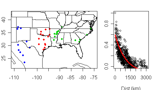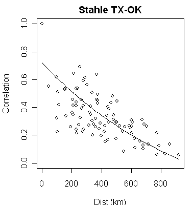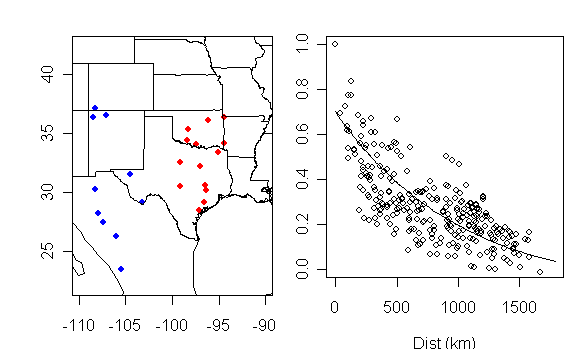 First here is a fresh location map on the left showing the SWM network in blue and the TXOK network in red, yielding a “squarer” overall span. On the right is a plot of intersite correlation versus intersite distance, again showing strong spatial autocorrelation (r-squared of about 0.7).