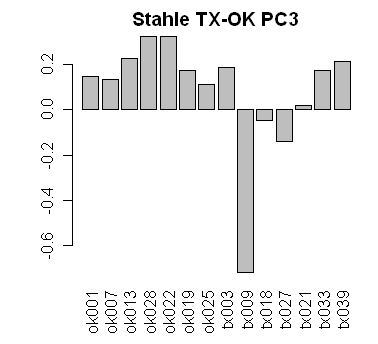 As with the Stahle SWM network, there is a strong pattern of spatial autocorrelation (see Top left). I’ve arranged the sites more or less from NE to SW and made barplots of the eigenvalues below, which show the distinctive Toeplitz pattern: the PC1 is sort of a weighted average with all coefficients positive; the PC2 is a gradient with one sign change; the PC3 has two sign changes. All of which indicates that the network can be approximated by a Toeplitz network – which is more restrictive than mere spatial autocorrelation.