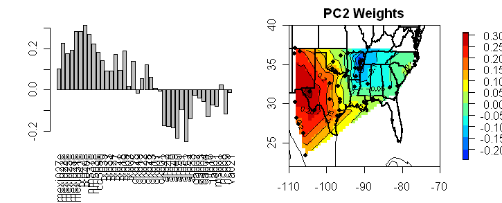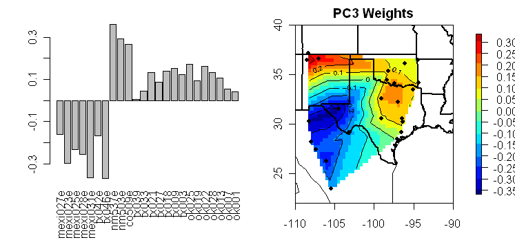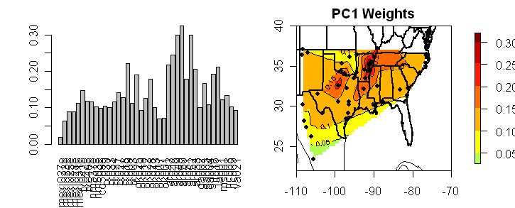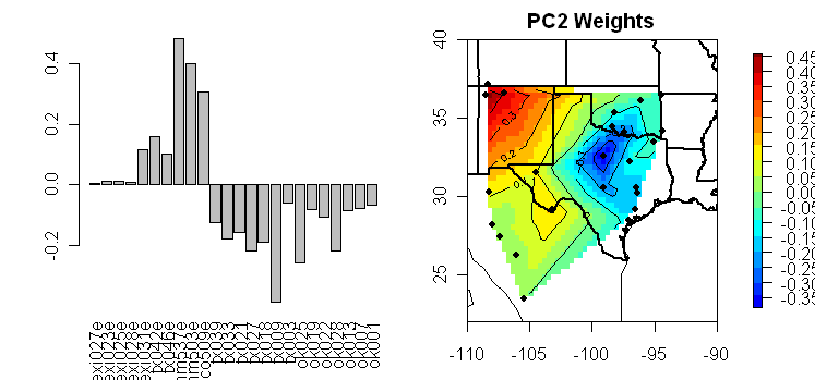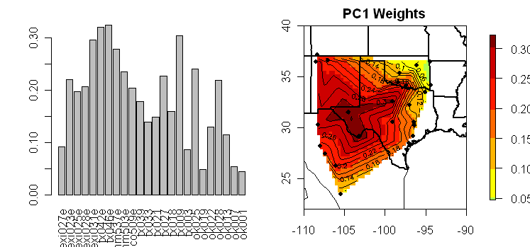 Next here is graphic showing on the left the barplot of eigenvector coefficients for the PC1 and the contour map. All of the sites are positively correlated and thus the PC1 is a weighted average. There is a concentration of weight at a few interior sites which is predictable in a spatial autocorrelation model on the basis that they are more correlated with sites on the perimeter than the sites on perimeter are to each other, due to shorter distances. Thus, any “accidental” properties of the interior sites in this network will get accentuated at the price of whatever signal may exist.