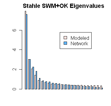 No reason was given in MBH for not combining the SWM and TX-OK networks. But regardless, one would like to see how stable the eigenvector properties are under simple mathematical operations like combining networks. Intuitively, if the eigenvectors of each network separately represented an important and distinct property, one would presume that the pattern would be recovered from the combined network. Let’s see.