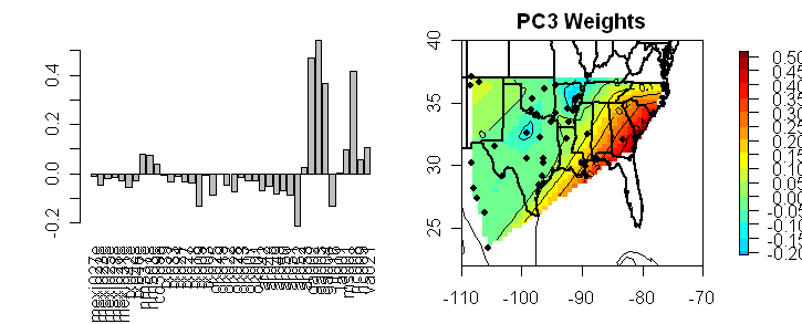 Next here are corresponding plots for the PC2 and PC3. In these cases, the eigenvector structure no longer has the simple patterns of the Toeplitz matrix though there are elements of gradient seeking. The PC2 has sort of a gradient from west to east, with low values in the south; while the PC3 runs from the SW to the NE with sort of a “valley”. It is my impression that these shapes are strongly controlled by the geometry of site locations combined with spatial autocorrelation; and that it is highly dubious that these eigenvector patterns have the faintest climatic significance. (Even if there was some second order information, it would be over-ridden by the geometrically controlled patterns anyway.)