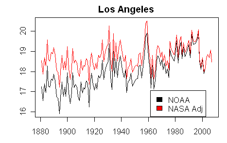 Note that the temperature graphic shown linked at Anthony’s site is the version used by NOAA, rather than the version used by NASA. The differences are shown in the two graphs below. The NASA adjusted version increases past L.A. temperatures by an amount increasing linearly to about 1.2 deg C, while NOAA uses a version without NASA’s urban adjustment.