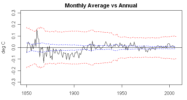 One minor curiosity which some reader may be able to explain. I compared the HadCRU GLB annual series – column 2 in http://hadobs.metoffice.com/hadcrut3/diagnostics/global/nh+sh/annual with the HadCRU GLB monthly series – column 2 in http://hadobs.metoffice.com/hadcrut3/diagnostics/global/nh+sh/monthly. I calculated annual averages from the monthly version and compared them to the archived annual version with the following result. I then manually compared values for 1861 (monthly: -0.811 -0.477 -0.491 -0.375 -0.765 -0.172 -0.308 -0.173 -0.379 -0.397 -0.410 -0.191 with an average of -0.4124167; as compared to the annual of -0.568. Perhaps this is explained somewhere. I didn’t see any explanations in the website explanations – if any one sees an explanation, I’d be interested.