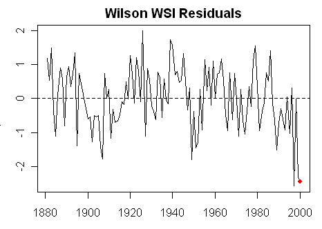 Rob noted that the data tracked well “except for the last two years” where there is a divergence. Visually, it looked to me like the divergence was more than just the last two years. Below is a plot of the residuals from a fit of RW against gridded temperature. While the negative residuals are more pronounced in the past few years, there does appear to be somewhat of a negative divergence trend in the residuals for more than the past two years. The Durbin-Watson statistic using the lmtest package in R was 1.50 – right at the red zone value – and differs substantially from the reported DW value of 1.98. I wonder how Rob calculated his DW statistic.