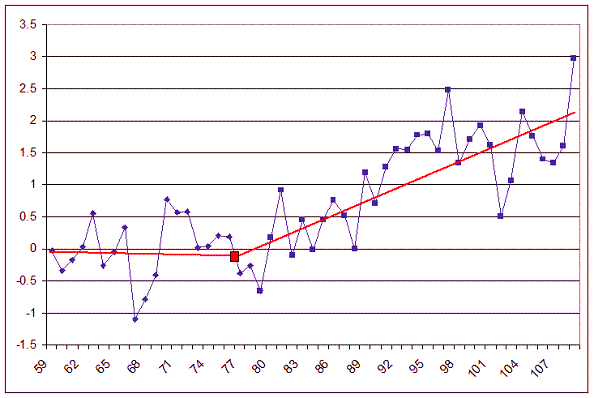 John G: “selecting each year as the knee in it’s search for the best broken-line fit to the curve.”