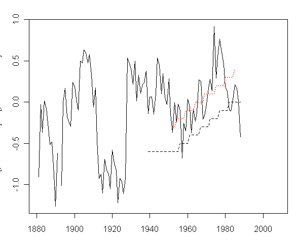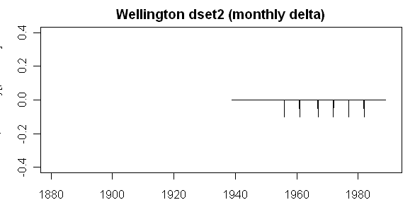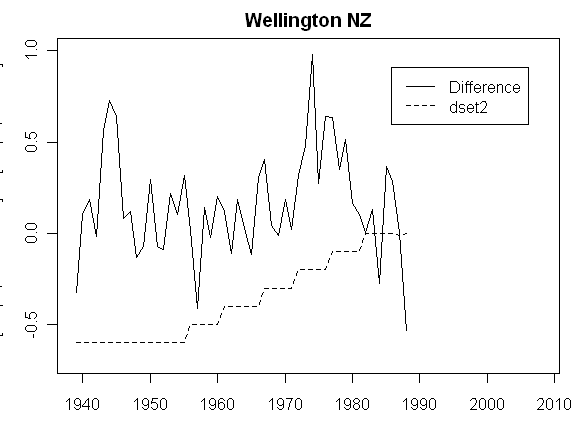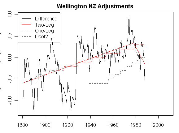 I’ve had a bit more luck decoding this sucker. The black jiggly series is the difference between the “reference” composite of 4 “rural” stations and the Wellington dset1 series. The dashed red line is a fit over the 1951-1984 period in which there are 3 stations; and the black dashed is the difference between dset2 and dset1. It looks like the adjustment in this case is coerced back to a one-legged adjustment and that the end values of the 1951-1984 adjustment are extended to the “extended” dset2 range of 1939-1988. I’ll pull these together in a longer note.