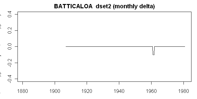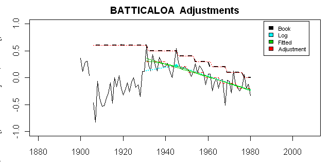 Steve, when I look at the blip in your Batticaloa adjustment versus the GISS adjustment, I see it falls roughly in the middle of the downward slope and simply reflects you extending the +.3 adjustment by one year versus GISS extending the +.2 adjustment by one year. So could the difference between yours and theirs be nothing more than rounding?