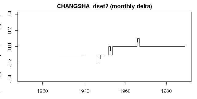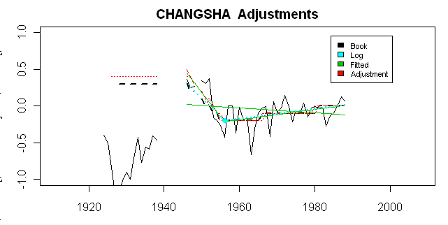 This discrepancy can be patched by changing the sign of the slopes preserved in the PAPARS log. Why? Who knows? Another GISTEMP zip, bop and whirr. Aside from this, once again, we have a bewildering extrapolation. In this case, there is a disconnected piece of the Changsha record, which ends in 1938, re-starting only after World War 2. The two pieces of the Changsha record come from one version and therefore Hansen doesn’t bother with quality control details (he requires a 10 year separation and different versions before it catches his attention.) Although the pre-1938 piece seems disconnected, nonetheless Hansen extrapolates the 1946 adjustment for the extension of the record back to 1926.