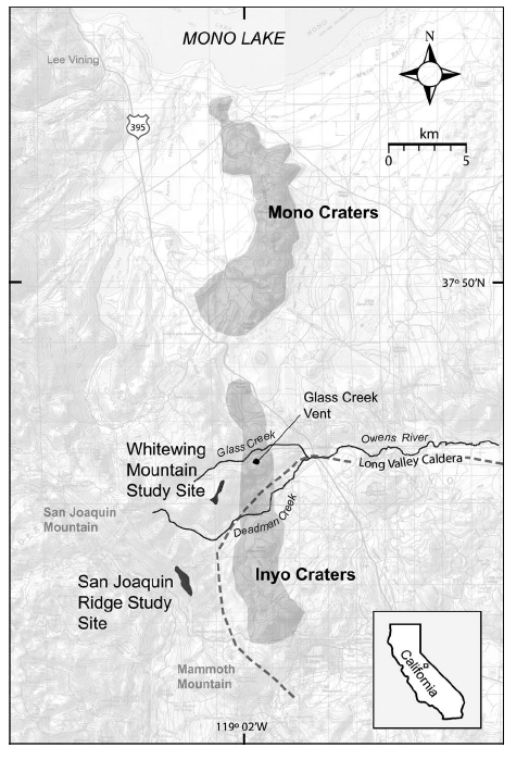 Preserved vegetation in the Mammoth Lakes – Long Valley Caldera region provides a detailed record of late Holocene climatic, vegetation, and volcanic dynamics. Scattered across the otherwise barren summits of Whitewing Mtn and San Joaquin Ridge, adjacent to and along the Sierra Nevada crest (Fig. 1), are abundant well-preserved deadwood tree stems (Fig. 2).