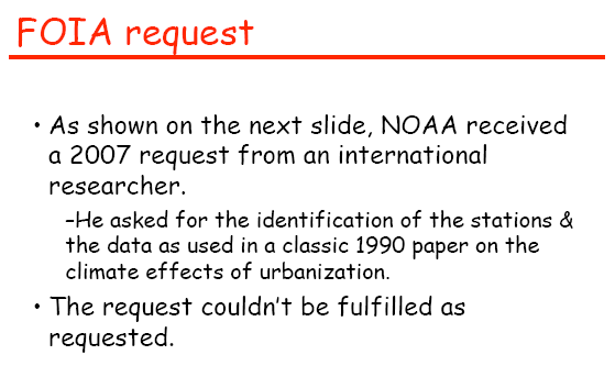 May I observe a certain irony in respect to the use of this FOI request in your presentations. I did not actually receive any reply from NOAA to this FOI request, not even an acknowledgement. The situation later became moot when the U.K. authors re-considered their prior refusal to provide the information. If NOAA had a hand in this, I’d like to express my appreciation, but I’d still like to note for the record, that the FOI request referred to in these presentations never received a reply.