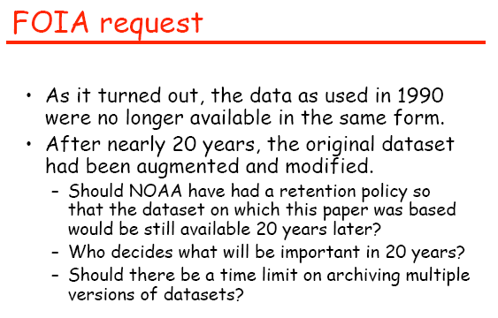 I notice that the following FOI request was discussed in two recent NOAA presentations:Tom Karl & Larry Tyminski, Co-Chairs: NOAA Data Management Committee. NOAA Science Advisory Board’s Data Archiving and Access Requirements Working Group (DAARWG), May 24-25, 2007